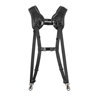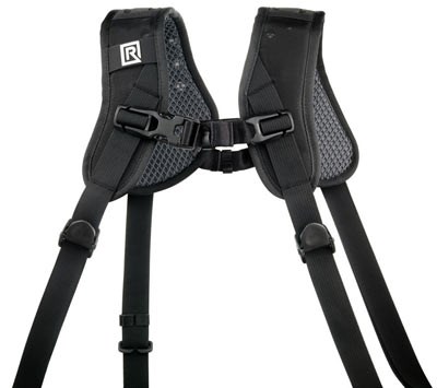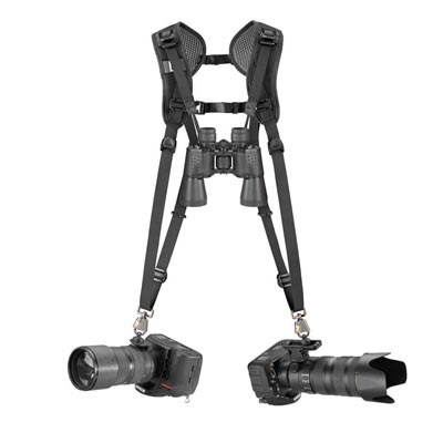 Able to hold two cameras, the Black Rapid Double Breathe is a double harness that is ideal for event, press, or sports photographers. The cameras hang from the right and left shoulders, resting upside-down by the photographer's hips so they can be quickly lifted for use. Breathable mesh pads cushion the back and shoulders to ensure that the photographer is comfortable and to minimise perspiration.