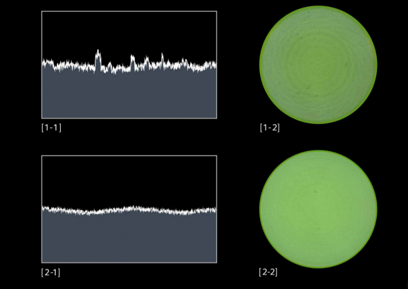[1-1] Typical lens element surface, [1-2] Artefacts affecting smoothness of Bokeh effect. [2-1] XA Element lens surface, [2-2] Smooth Bokeh effect achieved by XA element