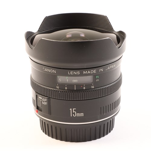 The Canon 15mm f2.8 is a fisheye lens with a 180° angle of view across the diagonal (on full frame digital and fil mcameras), for unique and intriguing effects. The wide depth of field makes it even more interesting and is bound to be an inspiration to your creativity. The short minimum focusing distance of 20cm gives new meaning to close-up shots. The lens has a fixed petal-type hood and a gelatin filter holder at the rear.