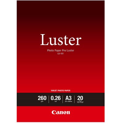 The Canon LU-101 Photo Paper Pro Luster A3 (20 sheets) provides the user with a pearl luster finish and exceptional quality, especially when used with Canon's genuine inks. The Pro Luster (260gsm) Paper dries in an instant and is ideal for precious moments such as portraits, weddings and graduations.