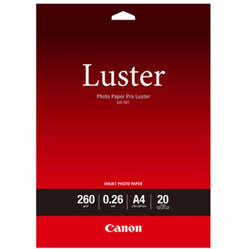 The Canon LU-101 Photo Paper Pro Luster A4 (20 sheets) provides the user with a pearl luster finish and exceptional quality, especially when used with Canon's genuine inks. The Pro Luster (260gsm) Paper dries in an instant and is ideal for precious moments such as portraits, weddings and graduations.