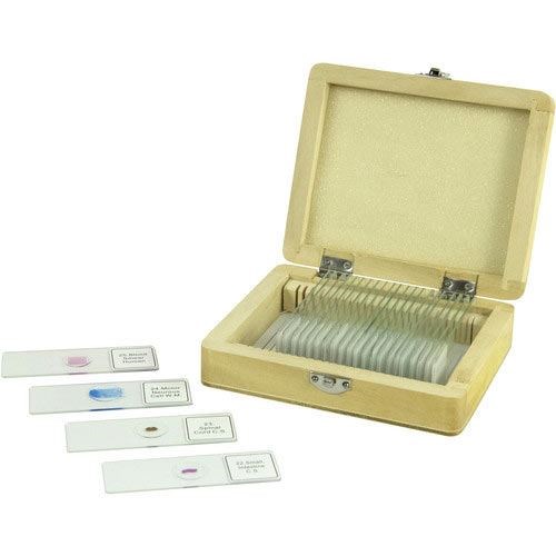 This kit from Celestron provides you with 25 glass slides, all numbered and labelled with individually prepared specimens. Each slide is sized at 1" x 3" (25 mm x 76 mm) and comes neatly packed and housed in a wooden case for extra protection. This kit contains unique samples of animal, insect, and plant tissue for endless fun and discovery.