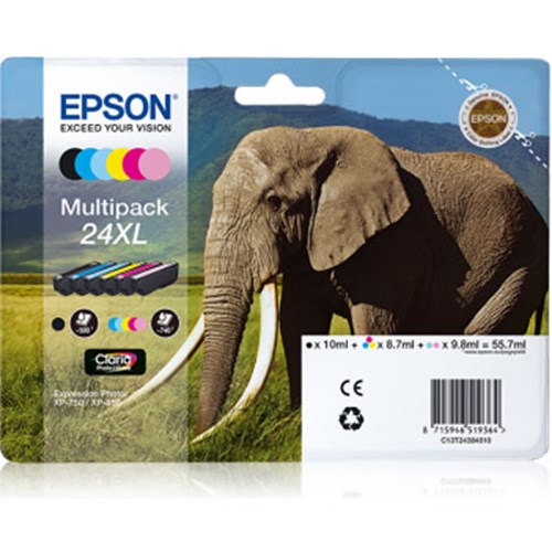 The Epson 24XL Multipack 6-colours Claria Photo HD Ink Cartridge pack contains a black, yellow, cyan, light cyan magenta and light magenta ink cartridge. The cartridges are designed for the Epson Expression Photo XP-750, XP-850 and XP-950 ink-jet printers. The Epson Claria dye-based ink cartridges provide smooth gradations and a truly vivid gloss finish.