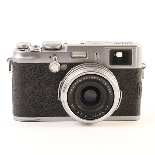 The Fuji FinePix X100 is a 12.3 megapixel digital camera with a high-quality APS-C size sensor and a bright 23mm (equivalent to 35mm in a 35mm camera) f/2 lens. The X100 combines cutting edge modern technology with the design aesthetics and handling of a classic camera. The unique Hybrid Viewfinder offers the brightness and clarity of an optical viewfinder with the benefit of digital viewfinder information display. With its clever technology housed in a high-precision magnesium alloy body, the X100 offers a combination of performance and ergonomics that means you won't want to put it down. Other features include a 2.8" LCD screen, ISO 200-12800, Flash hot shoe and built in flash, a built-in neutral density filter and 720p HD movie recording with stereo sound.