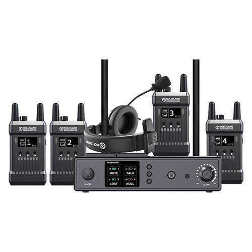 - Includes a base station, five headsets, and four beltpack transceivers