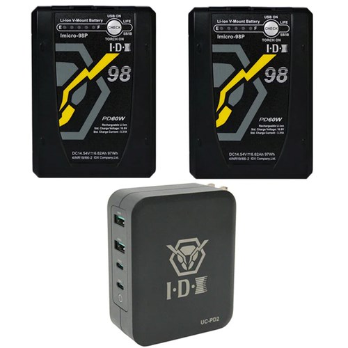 The IDX IM-98P/PD2 Kit includes two Imicro-98P 97Wh batteries and the compact UC-PD2 dual USB-C charger, perfect for travel and location shoots. The Imicro-98P batteries offer versatile power with a 100W D-Tap, 60W USB-C PD, and a V-Torch LED for low-light environments, while the UC-PD2 provides fast, efficient charging for two batteries in a pocket-sized design.