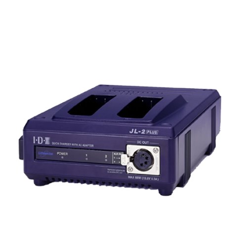 The IDX JL-2PLUS charges NP-style Li-ion, Ni-Cd, and Ni-Mh batteries sequentially, prioritising the first connected battery and charging the second once the first is fully charged. It features a built-in 4-pin XLR DC power supply (60W at 13.8V), allowing safe power for additional equipment like lighting when not in charging mode.