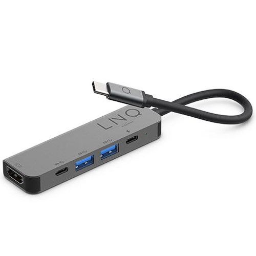 The LINQ 5in1 Pro USB-C Multiport Hub features a compact design including high-definition HDMI output, USB-A and USB-C ports. Shift your display to a larger screen for a more detailed and smoother view. It allows you to keep your laptop charged while transferring data at a transfer speed of 10 GB/s. Featuring a strong braided cable, the hub is compatible with 100 W PD chargers.