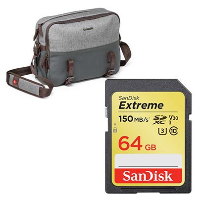 Manfrotto Lifestyle Windsor Reporter and SanDisk 64GB Extreme 150MB/Sec UHS-I SDXC CardStylish and practical, the Manfrotto Lifestyle Windsor Reporter is perfect for carrying a medium DSLR with 24-70mm lens attached, an additional 70-200mm f2.8 lens, a standard lens and a 13” laptop. With its vintage look, genuine leather trims and elegant fabric combination, this reporter bag is the perfect choice for weekend trips away. The inside of the bag is enhanced by a sophisticated “tartan” lining and there are plenty of pockets for keeping personal items separate.