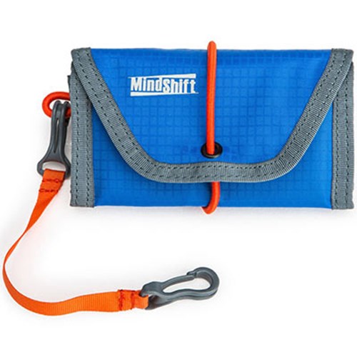 Securely store and protect your memory cards with MindShift Gear's House of Cards. This vibrant Tahoe Blue carry case allows users to conveniently access recording media and identify their cards when shooting. An orange elastic band holds the wallet close and offers silent access to their cards when shooting, so an interview will never be ruined the by sound of Velcro again.