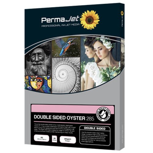 Permajet double sided Oyster A3 inkjet paper (25shts) (51222) is oyster/ pearl surfaced media of 285gsm with a photographic feel and finish. This is an instant dry resin coated paper coated both sides and finished with a microporous supercoat giving it a high degree of water and fade resistance. Compatible with Dye and Pigment inks. An ideal product for use in Portfolios, low volume books and specialist greetings cards/invitations.