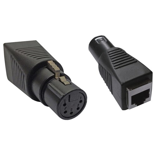 - Features and RJ45 male connection on one side, and 5-pin XLR connection on the other