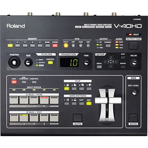 The Roland V-40HD Multi-Format Live Video Switcher is a welcomed addition to the powerful V-1600HD and V-800HD model lineup. The V-40HD is ideal for any live event or installation that requires the freedom to connect a variety of sources whether they be digital or analogue, computer or video format. It is positioned to support configurations using popular HDMI cameras as well as computers.