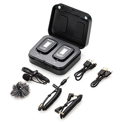 - Clip-on wireless transmitter/mic, lavalier mic, dual-channel receiver, and charging case