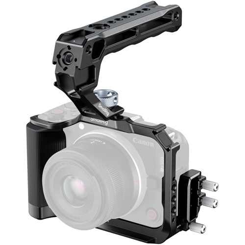 The SmallRig Cage Kit for the Canon EOS R50 V gives the compact body a steadier feel in the hand and a cleaner way to mount everyday accessories. The silicone side grip improves control for longer handheld spells, while the Arca base makes it easy to move between a tripod, a gimbal, or a simple tabletop setup. A lightweight top handle and cable clamp round out the kit, keeping small rigs tidy and ready to work.