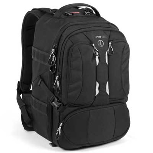 The Tamrac Anvil 23 will carry all of your photography gear to the grittiest and most beautiful places on earth. The main compartment can hold a pro DSLR body with telephoto lens attached, along with a full range of lenses, flashes and accessories. A front padded pocket holds most 15 inch laptops and exterior pockets hold accessories. There are also quick release straps for attaching a tripod. The comfortable airflow harness and removable M.O.L.L.E. compatible belt system makes any amount of gear easy to carry.