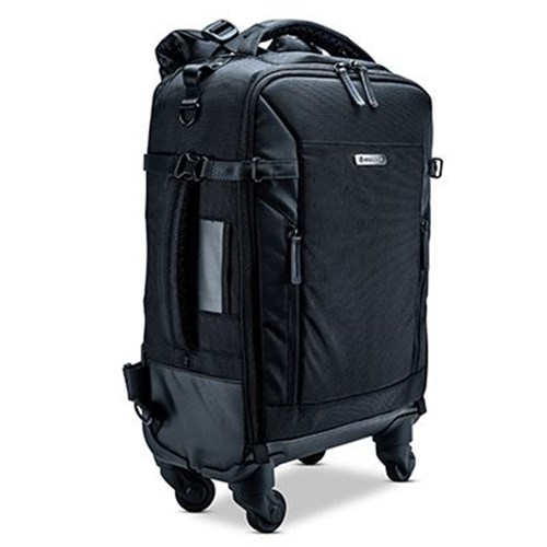 Back to topThe Vanguard VEO Select 55BT Roller Backpack is a backpack and a 4-wheel carry-on in one. It can fit two pro DSLRs or mirrorless system cameras, 5-6 lenses that are up to 300mm f/2.8, a flash unit, a 13-inch laptop along with a 9.7-inch tablet, a number of accessories including memory cards as well as cables, batteries, a charger and of course a tripod.